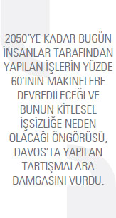 Davos’ta ise teknoloji şirketlerinin başını çektiği bir grup, akıllanan ve becerileri artan robotların iş alanlarında insanlara karşı avantajlı duruma geçmesinin olumlu bir gelişme olacağını savundu. Ancak aynı zamanda bu yaklaşımı oldukça tehlikeli bulanlar da vardı. Dile getirilen eleştirilerin başında yapılan araştırmaların sonuçlarına dayandırılan kaygılar geliyordu. Örneğin 2050’ye kadar bugün insanlar tarafından yapılan işlerin yüzde 60’ının makinelere devredileceği ve bunun kitlesel işsizliğe neden olacağı öngörüsü, Davos’ta yapılan tartışmalara damgasını vurdu.