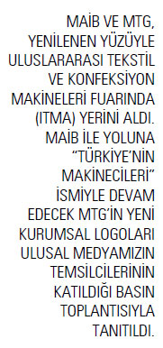 Makine İhracatçıları Birliği (MAİB) ile makine sektörünün markalaşması, Ar-Ge ve ortak tanıtım çalışmalarının organize edilmesi amacıyla 2007’den bu yana faaliyet gösteren Makine Tanıtım Grubu (MTG), Uluslararası Tekstil ve Konfeksiyon Makineleri Fuarında (ITMA) yeni dönem hedeflerini paylaştı ve yenilenen logosuyla basının karşısına çıktı.