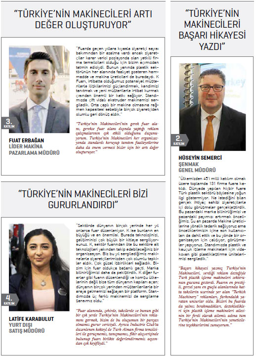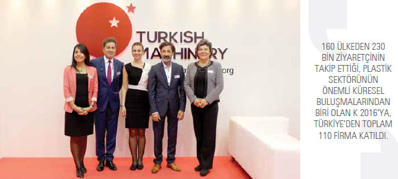 Türkiye’nin Makinecileri Almanya’da gerçekleştirilen plastik ve kauçuk sanayisi fuarı K’da ilk kez yer aldı. Almanya’nın Düsseldorf kentinde gerçekleştirilen fuarda bu yıl, 3 bin 285 firma ürünlerini sergiledi. 160 ülkeden 230 bin ziyaretçinin takip ettiği ve dünyanın en önemli plastik ve kauçuk sanayisi fuarı olan K 2016’ya, 24’ü İstanbul Kimyevi Maddeler ve Mamulleri İhracatçıları Birliği (İKMİB) ve PAGDER işbirliğiyle düzenlenen milli katılım organizasyonu dahilinde olmak üzere, 110 Türk firması katılarak ürünlerini ziyaretçilerin beğenisine sundu.