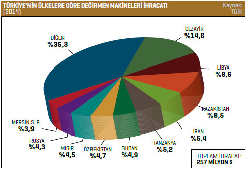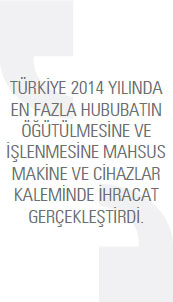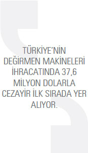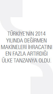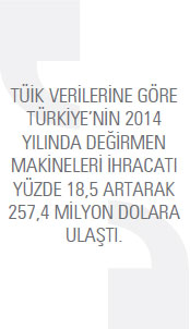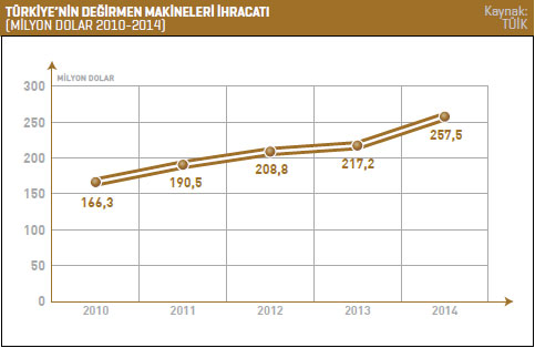 TÜİK verilerine göre Türkiye’nin değirmen makineleri ihracatı 2014 yılında, bir önceki yıla oranla yüzde 18,5 artarak 257,4 milyon dolara ulaştı. 2013 yılında bu rakam 217,2 milyon dolardı. Türkiye 2014 yılında en fazla Cezayir’e değirmen makineleri ihracatı gerçekleştirdi. 2013 yılında Söz konusu ülkeye 22,2 milyon dolarlık ihracat gerçekleştirilirken bu rakam, 2014 yılında yüzde 69,8 artarak 37,6 milyon dolar seviyesine yükseldi. Listenin ikinci sırasında ise Libya bulunuyor. Türkiye’nin Libya’ya yönelik değirmen makineleri ihracatı 2014 yılında 22,1 milyon dolar oldu. 2013 yılında bu rakam 21,2 milyon dolardı. Libya’ya yönelik değirmen makineleri ihracatı yüzde 4,6 arttı. Listenin üçüncü sırasında bulunan Kazakistan’a 2013 yılında 15,6 milyon dolar değerinde değirmen makinesi ihraç edilirken 2014 yılında bu rakam yüzde 40,4 artarak 21,9 milyon dolar seviyesine yükseldi. Türkiye’nin 2014 yılında değirmen makineleri ihracatını yüzde 527,7 ile en fazla artırdığı ülke ise Tanzanya oldu. Türkiye 2014 yılında en fazla hububatın öğütülmesine ve işlenmesine mahsus makine ve cihazlar kaleminde ihracat gerçekleştirdi. 2013 yılında söz konusu mal grubunda 128 milyon dolarlık ihracat gerçekleştirilirken bu rakam, 2014 yılında yüzde 10,7 artarak 141,7 milyon dolar seviyesinde kaydedildi.