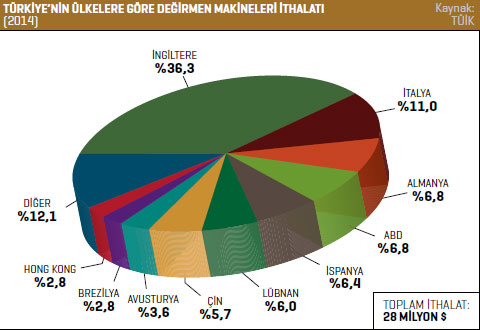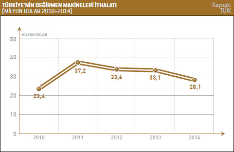 dolar seviyesindeyken, 2014 yılında bu rakam yüzde 14,9 artarak 24 milyon dolar oldu. TÜİK verilerine göre Türkiye’nin değirmen makineleri ithalatı 2013 yılında 33,1 milyon dolarken bu rakam, 2014 yılında yüzde 15 azalarak 28,1 milyon dolar olarak kaydedildi. Türkiye 2014 yılında 10,2 milyon dolarla en fazla İngiltere’den değirmen makinesi ithal etti. 2013 yılında söz konusu ülkeden gerçekleştirilen ithalatın değeri 10,4 milyon dolardı. Türkiye’nin 2014 yılında İngiltere’den gerçekleştirdiği ithalat yüzde 2,2 azaldı. Listenin ikinci sırasında bulunan İtalya’dan 2013 yılında 2,7 milyon dolarlık değirmen makinesi ithal edilirken bu rakam, 2014 yılında yüzde 15,4 artarak 3,1 milyon dolar olarak kaydedildi. Üçüncü sırada bulunan Almanya’dan 2014 yılında 1,9 milyon dolar değerinde değirmen makinesi ithal edildi. 2013 yılında Türkiye’nin söz konusu ülkeden gerçekleştirdiği ithalat 4 milyon dolardı. 2014 yılında Türkiye’nin Almanya’dan gerçekleştirdiği değirmen makineleri ithalatı yüzde 51,5 azaldı. Türkiye’nin 2014 yılında değirmen makineleri ithalatını en fazla artırdığı ülke yüzde 19,9 ile Avustralya oldu. Söz konusu ülkeden 2013 yılında 800 bin dolar değerinde değirmen makinesi ithal edilirken 2014 yılında bu rakam 1 milyon dolar değerine yükseldi. Türkiye 2014 yılında en fazla tohum, hububat veya kuru baklagillerin temizlenmesine, tasnif edilmesine veya ayıklanmasına mahsus makineler kaleminde ithalat gerçekleştirdi. Söz konusu ürün grubunda 2013 yılında 22,5 milyon dolarlık ithalat gerçekleştirilirken bu rakam 2014 yılında, yüzde 10 azalarak 20,3 milyon dolar oldu. Listenin ikinci sırasında bulunan hububatın öğütülmesine ve işlenmesine mahsus makine ve cihazlar kaleminde 2014 yılında 2,5 milyon dolar değerinde ithalat gerçekleştirildi. 2013 yılında bu rakam 800 bin dolardı. Hububatın öğütülmesine ve işlenmesine mahsus makine ve cihazlar ürün grubundaki ithalat yüzde 215,9 arttı. Listenin üçüncü sırasındaki aksam ve parçalar; değirmencilik dışında kullanılmaya mahsus baklagil veya hububatı öğüten, işleyen makine ve cihazlar kaleminde 2013 yılında 2,2 milyon dolar değerinde ithalat gerçekleştirilirken bu rakam 2014 yılında yüzde 8,1 azalarak 2 milyon dolar seviyesinde kaydedildi.