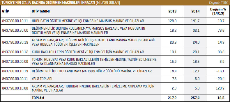 Listenin ikinci sırasında yer alan değirmencilik dışında kullanılmaya mahsus baklagil veya hububatın öğütülmesi ve işlenmesine mahsus makineler ürün grubunda 2014 yılında gerçekleştirilen ihracatın değeri 32,1 milyon dolar olarak kaydedildi. 2013 yılında bu rakam 18,2 milyon dolardı. Değirmencilik dışında kullanılmaya mahsus baklagil veya hububatın öğütülmesi ve işlenmesine mahsus makineler ürün grubundaki ihracat yüzde 76,6 artış gösterdi. Listenin üçüncü sırasındaki aksam ve parçalar; değirmencilik dışında kullanılmaya mahsus baklagil veya hububatı öğüten, işleyen makineler ihracatı 2013 yılında 20,9 milyon