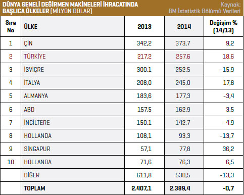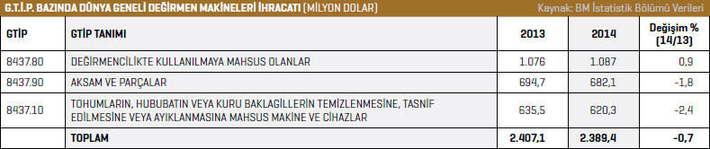 0,7 azalarak 2,3 milyar dolar seviyesinde kaydedildi. İhracat listesinin ilk sırasında bulunan Çin, 2014 yılında 373,7 milyon dolar değerinde değirmen makinesi ihraç etti. 2013 yılında bu rakam 342,2 milyon dolar seviyesindeydi. Çin’in değirmen makineleri ihracatı yüzde 9,2 arttı. Listenin ikinci sırasındaki Türkiye 2013 yılında 217,2 milyon dolar değerinde değirmen makinesi ihraç ederken, 2014 yılında bu rakam yüzde 18,6 artarak 257,6 milyon dolar olarak kayda geçti. E