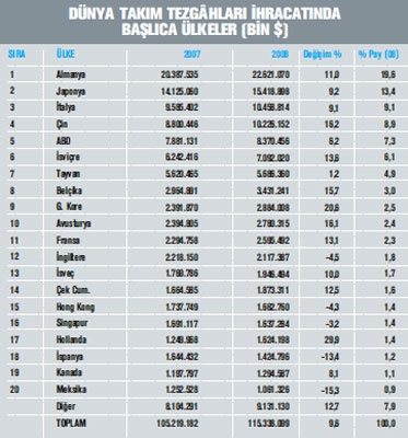 Takım tezgâhları sektöründe, 2008 yılı Ocak-Aralık döneminde Almanya, Rusya Federasyonu ve Bursa Serbest Bölgesi ilk üç pazar konumundayken, 2009 yılı ilk sekiz aylık verilere göre Almanya yerini korudu. İkinci sırayı İran, üçüncü sırayı da 2008 yılında ilk 15 ülke arasında bulunmayan Irak aldı. Sektör, 2008 yılında (serbest bölgeler dahil olmak üzere) 161 ülkeye ürün ihraç etti. 2008 yılında sektör ihracatımızda en büyük payı alan ilk 15 ülke arasında ihracat artışı esas alındığında yüzde 174 artış ile Azerbaycan-Nahcıvan’ın ilk sırada yer aldığı görülüyor. Yüzde 134 ile Brezilya ve yüzde 121 ile Avusturya sektör ihracatımızda önemli oranda artış kaydedilen diğer önemli iki ülke. Söz konusu dönemde ilk 15 ülke arasında Bursa Serbest Bölgesi, Ukrayna ve İspanya’ya yönelik sektör ihracatında ise gerileme meydana geldi.