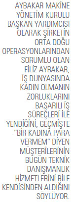 Sadece bizim sektörümüzde değil, her sektörde benzer sıkıntılar yaşandığını düşünüyorum. Halen Aybakar’ın Orta Doğu’daki projelerini yönetiyorum ve bu bölgede iş kadını olmak daha da zor. Benim deneyimlerimden çıkarttığım; ilk önce kendinizi kabul ettirmeniz gerekiyor. İlk çalışma yıllarımda “bir kadına bu kadar para veremem” diyen müşterilerim olmuştu. Aynı şekilde “kadın makineden ne anlar” diye yaklaşan müşterilerim de vardı. Ama şimdi aynı müşteriler teknik danışmanlık hizmetlerini de bizden, benden alıyor. Dolayısıyla, insanlar başarılı iş süreçlerimiz karşısında bana güvenebileceklerini öğrendi ve şimdi biliyorlar ki bir kadın da bu sektörde var olabilir ve kadınlarla da güvenle iş ortaklığı sürdürülebilir.