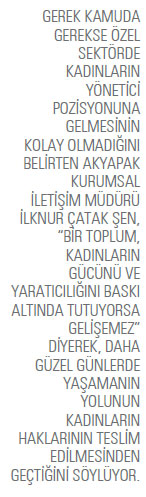 Öncelikle ülkemizde kadın çalışan olmak zor. Terfi kararlarında erkeklere öncelik veriliyor, aynı işi yapan, görev tanımı aynı olan işlerde erkekler kadınlara göre daha fazla ücret kazanıyor. Bu örnekleri çoğaltabiliriz. 2013 itibarıyla Türkiye’de istihdam oranı yüzde 47,4. 2012 verilerine göre, işgücüne katılım oranı kadınlarda yüzde 29,5 erkeklerde yüzde 71. İstihdam edilen kadın nüfus oranı yüzde 26,3, erkek nüfus oranı yüzde 65. Veriler açık… Yani Türkiye’deki iş hayatında kadın olmak başlı başına ba - şarı bence. Oysa ki ülkemizin dünyadaki ilk 10 ekonomi arasında yer alması