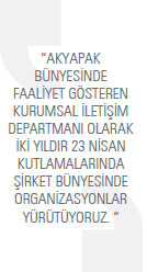 eyeceğini söylemek gerekiyor. Bilinmiyor ki kurumsal iletişim faaliyetleri içerisinde ayrı bir şekilde konumlanan, ülkemizde bir çok kurum ve kuruluşun kendi bünyesindeki yapılanma dışında hizmet satın alarak yönettiği ‘medya ilişkileri’ kendi içinde hassas dengeleri barındırıyor. PR alanın önemli çalışma konularından bir olan medya ilişkilerinde başarının yolu ise uzun dönemli tutarlı ve gerçekten iyi niyete dayalı ilişkilerin kurulmasından geçiyor. Aslında her ilişki biçiminde de olması gereken bu değil midir? Ne ekersen, onu biçiyorsun. Bir iletişimci olarak müşterinin veya çalıştığın kurumun medya ilişkilerinde başarı, bu süreçte medya kuruluşlarında ilgili haberlerinin yayınlanmasını sağlamak için uyguladığın yöntemlerde bilgi ve deneyim sahibi olmakla mümkün. Bu sadece bir yönü, lider iletişimi, marka ve alt markalar iletişimi, STK’lar, iç iletişim, kriz iletişimi gibi çok yönlü kurumsal ilişkiler anlayışı olmadıkça kurumsal iletişim anlaşılamaz. Tam da bu noktada yine biz iletişimcilere görev düşüyor ve işimizi yapmanın yanında işimizin yarattığı katma değeri anlatmak da bizlere kalıyor. Bu noktada, Yönetim Kurulu Başkanımız Levent Akyapak’a ve Yönetim Kurulu Üyemiz Sayın Büşra Akyapak’ a vizyonları ve kurumsal iletişim birimi olarak gerçekleştirmeyi arzuladığımız çalışmalarda desteklerini esirgemedikleri için teşekkür ediyorum. Üretim odaklı yapılanmalarda özellikle yönetim desteği olmadan alanımızda fark yaratmak pek mümkün değil.