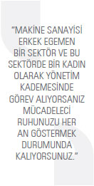 için kadının ekonomiye katılım oranı yüzde 100 artmalı. Makine sektörüne gelince, dediğiniz gibi erkek egemen bir sektör ve bu sektör de yönetim kademesinde görev alıyorsanız mücadeleci ruhunuzu her an göstermek durumunda kalabilirsiniz.