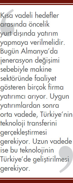 Kısa vadeli hedefler arasında öncelik yurt dışında yatırım yapmaya verilmelidir. Bugün Almanya’da jenerasyon değişimi sebebiyle makine sektöründe faaliyet gösteren birçok firma yatırımcı arıyor. Uygun yatırımlardan sonra orta vadede, Türkiye’nin teknoloji transferini gerçekleştirmesi gerekiyor. Uzun vadede ise bu teknolojinin Türkiye’de geliştirilmesi gerekiyor. Bu sayede Türkiye’nin ihracattan aldığı pay artabilir.