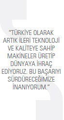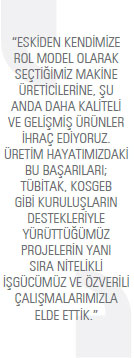 2005’ten sonra üretimimizi Avrupa’daki bazı firmaları örnek alarak gerçekleştirmeye başladık. Bugün geliştirdiğimiz bu makinelerin patent ve faydalı model belgelerini alacak duruma geldik. Eskiden kendimize rol model olarak seçtiğimiz makine üreticilerine, şu anda daha kaliteli ve gelişmiş ürünler ihraç ediyoruz. Üretim hayatımızdaki bu başarıları TÜBİTAK, KOSGEB vb. kuruluşların destekleriyle yürüttüğümüz projelerin yanı sıra nitelikli işgücümüz ve özverili çalışmalarımızla elde ettik. Buradan hareketle söylemek isterim ki, eskiden bizim gibi Avrupa’yı örnek almış birçok firma bugün sektöre yön verebilecek bir konuma geldi. Türkiye olarak artık ileri teknoloji ve kaliteye sahip makineler üretip dünyaya ihraç ediyoruz. Bu başarıyı sürdüreceğimize inanıyorum.