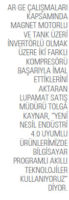 Günümüzde firmalar verimliliklerini ve üretim kapasitelerini artırırken, aynı zamanda işletme giderleri ve risklerini de azaltan çözümler arıyor. 50 yıldır kompresör imal eden Lupamat’ın bütün ürünleri enerji verimliğine sahiptir ve uzun ömürlüdür. Sektörde lider kompresör üreticilerinden biri olarak basınçlı hava teknolojilerine yön veren bir yapıya sahibiz. Son üç yıl içerisinde enerji tasarruflu kompresörlerimizin satışı ciddi oranda arttı. Bu artışın en önemli sebepleri; ürünlerimizde yaptığımız uygulamalar, kullandığımız ekipmanlar ve iyi bir Ar-Ge yapısına sahip olmamızdır. 75kW ve üzeri bütün serilerimizde standart olarak daha etkin soğutma sağlayabilen radyal fan kullanıyoruz. Ayrıca radyal fanda da invertör uygulaması yapmamız, rakiplerimizle aramızdaki en büyük farklardan biridir. Yeni nesil Lupamat DHK PLUS ve DHK PREMIUM (değişken devirli hız kontrollü) serilerinde enerji maliyetini en az seviyede tutarak en yüksek verim sağlayan kompresörler üretiyoruz. Bu ürünlerimizde yüzde 35’e kadar enerji tasarrufu sağlıyoruz. Diğer yandan standart kompresörlerimizde sunduğumuz oransal kontrol valfi sayesinde müşterilerimize de enerji tasarrufu sağlayan çözümler sunuyoruz. Yaptığımız tespitlere göre müşterilerimize ısı geri kazanım uygulaması yapıyoruz. Isı geri kazanım sistemleri, ısıtma veya sıcak su ihtiyacının tamamını karşılarken, yatırım maliyetini de düşürüyor. Isının tamamının kullanılabildiği durumlarda sistemin kendini iki yıldan az bir sürede ödeyebildiği de sıkça görülüyor.