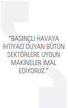 Basınçlı havaya ihtiyacı duyan bütün sektörlere uygun makineler imal ediyoruz. Ürün çeşitliliğimizin fazla olmasının yanı sıra bütün ürünlerimizde enerji verimliliğini ön planda tutuyoruz. Küçük işletmeler için farklı kapasitelerde pistonlu kompresör; orta ve büyük ölçekli işletmeler için (2,2 kW-450 kW güç aralığında) vidalı kompresör; dişçilik, gıda, ilaç sektörü ve hastaneler gibi yüzde 100