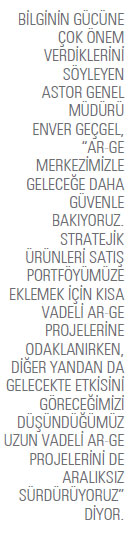 Sektörde fiyat rekabeti değil kalite rekabetine önem verdiklerini de vurgulayan Geçgel, 455 çalışanıyla büyük bir aile olduklarını söylerken, ASTOR’un sürdürdüğü Ar-Ge çalışmalarıyla bilgi birikimini artırmayı, böylece ürün gamını geliştirerek Türkiye’nin 2023 yılı ihracat hedeflerine katkı sağlamayı amaçladıklarını da ifade ediyor.
