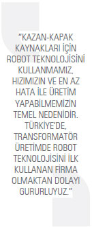 bulunduruyor olmasıdır. Bu başarıda, kullandığımız makinelerin tam otomatik olmasının da büyük önemi var. Bunların yanı sıra, kendi dalga duvarını yapan sistemimiz ve dağıtım trafolarının üretiminde kullanılan sarım makine sayısının ortalamanın üç kat üzerinde olması, kazan-kapak kaynakları için robot teknolojisini kullanmamız, hızımızın ve en az hata ile üretim yapabilmemizin temel nedenidir. Türkiye’de, transformatör üretimde robot teknolojisini ilk kullanan firma olmaktan dolayı gururluyuz. Tabii ki bu gelişmelerin, yenilikçi bir anlayışın sonucu olduğunun da altını çizmeliyiz. Toplamda bakarsak, ASTOR’un rakiplerine göre temel üstünlükleri, yenilikçi ve gelişime açık yapısı, yetkin personeli ve Ar-Ge çalışmalarıyla kaliteli ve hızlı üretim yapabilmesidir.