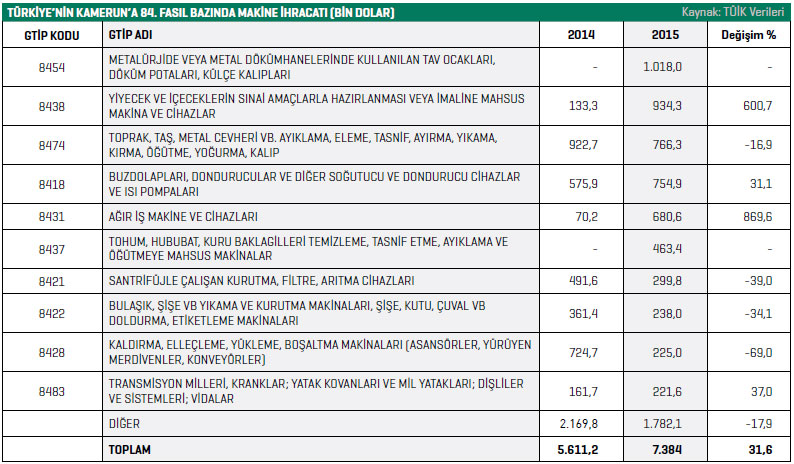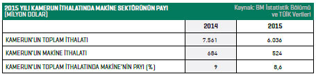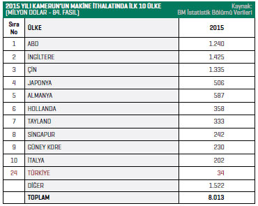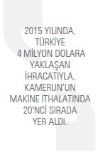 Türkiye ise Kamerun’un makine ithalatında 2015 yılında 20’nci sırada yer aldı. TÜİK verilerine göre, Türkiyeli makine üreticileri, 2015 yılında yüzde 31,6 ihracat artışı yakaladı ve Kamerun’a 7,4 milyon dolar değerinde makine ihraç etti.
