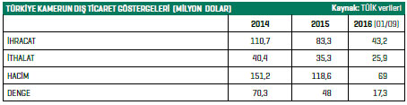 Türkiye ile Kamerun arasındaki ticari ilişkilerin genel olarak iki ülke açısından da düşük seyrettiği söylenebilir. Türkiye Kamerun’la yapılan ticarette 2003-2007 döneminde açık, 2008-2015 döneminde ise fazla vermeye başlarken, Türkiye’nin Kamerun’a ihracatı 2007 yılından itibaren yükselmeye başladı ve 2009 yılında yaklaşık yüzde 55’lik artışla 50 milyon dolara ulaştı. 2010 yılında da bu seviyeye yakın miktarda gerçekleşen ihracat 2011’de ise bir önceki yıla göre bu kez yüzde 116 artarak 105 milyon dolara yükselirken, Kamerun’dan gerçekleştirilen ithalat da yüzde 20 civarında arttı ve 47,7 milyon dolara ulaştı. Bu rakamlar ve ticaretin gelişim hızı, iki ülke arasındaki ticaretin gelişmeye açık olduğunun en büyük göstergesi olarak değerlendirilebilir.