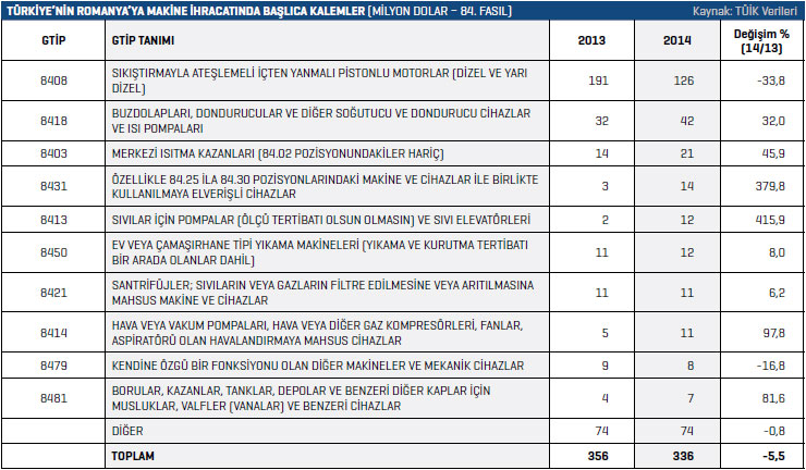 Romanya’ya gerçekleştirdiği makine ihracatı, 2014 yılında 336 milyon dolar olarak kaydedildi. 2013 yılında bu rakam 356 milyon dolar seviyesindeydi. Romanya’ya yönelik makine ihracatı yüzde 5,5 azaldı. Türkiye’nin Romanya’ya yönelik makine ihracatının ilk sırasında sıkıştırmayla ateşlemeli içten yanmalı pistonlu motorlar (dizel ve yarı dizel) yer alıyor. Söz konusu kalemde Romanya’ya 2013 yılında 191 milyon dolar değerinde ürün ihraç edilirken bu rakam 2014 yılında 126 milyon dolar seviyesinde kaydedildi. Söz konusu mal grubunda 2014 yılında ihracat yüzde 33,8 azaldı. Listenin ikinci sırasında bulunan buzdolapları, dondurucular ve diğer soğutucu ve dondurucu cihazlar ve ısı pompaları ürün grubunda 2014 yılında gerçekleştirilen ihracatın değeri 42 milyon dolar olarak kaydedildi. 2013 yılında bu rakam 32 milyon dolardı. Buzdolapları, dondurucular ve diğer soğutucu ve dondurucu cihazlar ve ısı pompaları ürün grubundaki ihracat yüzde 32 arttı. Türkiye’nin Romanya’ya makine ihracatında ilk 10 ürün grubu listesinin üçüncü sırasında ise merkezi ısıtma kazanları (84.02 pozisyonundakiler hariç) bulunuyor. 2013 yılında söz konusu kalemde 14 milyon dolarlık ihracat gerçekleştirilirken bu rakam, 2014 yılında yüzde 45,9 artarak 21 milyon dolar olarak kaydedildi. TÜİK verilerine göre 2014 yılında 84. fasıl itibariyle Türkiye’nin Romanya’dan makine ithalatı 2014 yılında 237 milyon dolar olarak kaydedildi. 2013 yılında bu rakam 267 milyon dolardı. Türkiye’nin 2014 yılında Romanya’dan gerçekleştirdiği makine ithalatı yüzde 11 oranında azaldı.