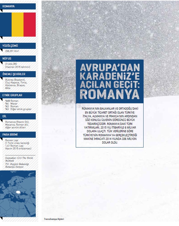 Avrupa’nın güney doğusunda yer alan ve Polonya’nın ardından Orta ve Doğu Avrupa’nın en büyük ikinci pazarı durumunda olan Romanya’da, sanayileşme sürecine girilmesiyle birlikte güçlü bir kırsal göç gerçekleşti. II. Dünya Savaşı’ndan ağır yaralarla çıkan Romanya, ekonomisini kalkındırmak için büyük bir mücadele dönemine girdi. Aralık 1989 Devrimi’nden sonra serbest piyasa sistemine adapte olmaya başlayan ülke, iktisadi gelişme amacıyla dış ticarete önem verdi. Ayrıca, yine bu amaçla pek çok reformlar yapıldı. Kısa sürede hisselerinin çoğu devlet kontrolü altında bulunan bütün kuruluşların hızlı ve şeffaf bir biçimde özelleştirilmesi ve vatandaşların hayat standardının yükseltilmesi yönünde politikalar uygulamaya konuldu. Bu reformlar özellikle, IMF, Dünya Bankası ve Avrupa Birliği gibi uluslararası oluşumlar tarafından desteklendi. Bu önemli gelişmelerle beraber 1 Ocak 2007 itibariyle ülkenin Avrupa Birliği tam üyesi olması, Romanya’yı Avrupa’nın cazip ülkelerinden biri haline getirdi. Romanya ekonomisinin karşı karşıya olduğu çeşitli problemler mevcuttur. Ülke’de kayıt dışı ekonomimin büyük bir alanı kapsaması, vergi sistemine düşük oranda katkı sağlayabilen kırsal nüfusun yüksek olması, vergilerin düzenli olarak toplanamaması gibi sorunlar sebebiyle vergi gelirleri yeterli düzeye ulaşamıyor. Bu nedenle eğitim, sağlık, refah, altyapı ve güvenlik harcamaları yeterli düzeyde gerçekleştirilemiyor. Romanya, Doğu Avrupa ülkeleri arasında en düşük kişi başı gelire, çevre standartları açısından en düşük seviyeye, en yüksek ödenmemiş vergi borçlarına ve en düşük eğitim harcamasına sahiptir. Ülkenin Euro Bölgesi ile kurmuş olduğu sıkı ticari ve mali bağlar, ekonomisini bu bölgedeki gelişmelere karşı riskli hale getiriyor. 2014 yılında tarımın GSYİH’deki payı 12,1, sanayinin 35,7 ve hizmetlerin 54,7 olarak gerçekleşti. Ülkede 2000’li yıllarda yaşanan hızlı büyüme, ekonomik değerlerdeki yükselişler ve AB üyeliği sonrası bu trendin devam etmesi sürecinde 2007 yılında yüzde 6,3, 2008 yılında ise yüzde 7,3 gibi AB ortalamalarının üzerinde GSYİH büyüme oranları yakalanmış fakat 2008 yılında yaşanan küresel finansal kriz nedeniyle bu süreç kesintiye uğramıştır. 2009 yılında yüzde 6,6’lık bir küçülme sonrası 2010 yılında bir miktar toparlanma gözlenmiş olmakla birlikte küçülme oranı yüzde 1,6 olarak gerçekleşti. 2011 yılına gelindiğinde Romanya GSYİH’si yüzde 2,5 oranında büyüme gösterdi. 2012 yılında gerçekleşen büyüme oranı yüzde 0,7 oldu. 2014 yılında yüzde 2,8 oranında büyüyen ülkenin 2015 yılı için beklentisiyse 3,7’dir. Ülke GSYİH’si 2008 yılında zirve noktası olan 204,3 milyar dolara ulaşmış fakat bu oran kriz sonrası 2011 yılında 189,8 milyar dolar olarak gerçekleşmiştir. 2014 itibariyle söz konusu büyüklük 199 milyar dolardır.