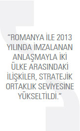 Romanya ile 2013 yılında imzalanan Stratejik Ortaklık Belgesi’yle iki ülke arasındaki ilişkiler, stratejik ortaklık seviyesine yükseltildi. Romanya’ya yönelik başlıca ihraç ürünlerimizi tekstil, demir-çelik, kara taşıtları, enerji üreten makine ve cihazlar oluştururken; ithalatımızda ise metal cevherleri, demir-çelik, ham petrol ürünleri ve kara taşıtları öne çıkıyor. 2015 yılının ilk altı ayında ihracatımız 1,33 milyar dolar, ithalatımız da 1,4 milyar dolar olarak kaydedildi. Romanya’nın Balkanlar ve Ortadoğu’daki en büyük ticaret ortağı olan Türkiye; İtalya, Almanya ve Fransa’nın ardından Romanya’nın dördüncü büyük ihracat pazarıdır. Romanya’daki Türk yatırımları, üçüncü ülkeler üzerinden gelenlerle beraber toplam 6 milyar dolara ulaştı. Halihazırda Romanya’da 7 bin civarında Türk firması aktif olarak faaliyet gösteriyor. Romanya’da bugüne kadar 90 Türk müteahhitlik firması tarafından yaklaşık 6,2 milyar dolar tutarında proje