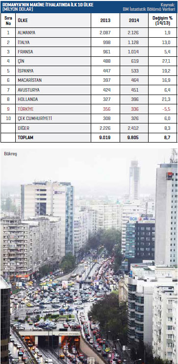 BM İstatistik Bölümü verilerine göre Romanya’nın makine ithalatı 2014 yılında bir önceki yıla oranla yüzde 8,7 artarak 9,80 milyar dolar olarak kaydedildi. 2013 yılında bu rakam 9,19 milyar dolar seviyesindeydi. 2014 yılı rakamlarına göre Romanya’nın en fazla makine ithal ettiği ilk 10 ülke listesinin ilk sırasında Almanya bulunuyor. Almanya’dan 2013 yılında 2,87 milyar dolar değerinde makine ithal eden Romanya’nın, 2014 yılı makine ithalatı yüzde 1,9 artarak 2,126 milyar dolar olarak kaydedildi. Romanya, 2014 yılında listenin ikinci sırasında bulunan İtalya’dan 1,13 milyar dolar değerinde makine ithal etti. 2013 yılında bu rakam 998 milyon dolar seviyesindeydi. 2014 yılında Romanya’nın İtalya’dan gerçekleştirdiği makine ithalatı yüzde 13 arttı. Romanya’nın 2014 yılında en fazla makine ithal ettiği ilk 10 ülke listesinin üçüncü sırasında ise Fransa yer alıyor. Romanya 2013 yılında Fransa’dan 961 milyon dolar değerinde makine ithal ederken bu rakam, 2014 yılında yüzde 5,4 artarak 1,14 milyar dolar olarak kaydedildi. Romanya’nın 2014 yılında, ilk 10 ülke arasında bir önceki yıla göre makine ithalatını en fazla artırdığı ülke Çin oldu. Çin’den 2013 yılında 488 milyon dolar değerinde makine ithal edilirken 2014 yılında bu rakam yüzde 27,1 artışla 619 milyon dolar seviyesinde kaydedildi. Türkiye, 336 milyon dolarla Romanya’nın 2014 yılında en fazla makine ithal ettiği ülkeler listesinin dokuzuncu sırasında bulunuyor. 2013 yılında bu rakam 356 milyon dolar seviyesindeydi. 2014 yılında Romanya’nın Türkiye’den makine