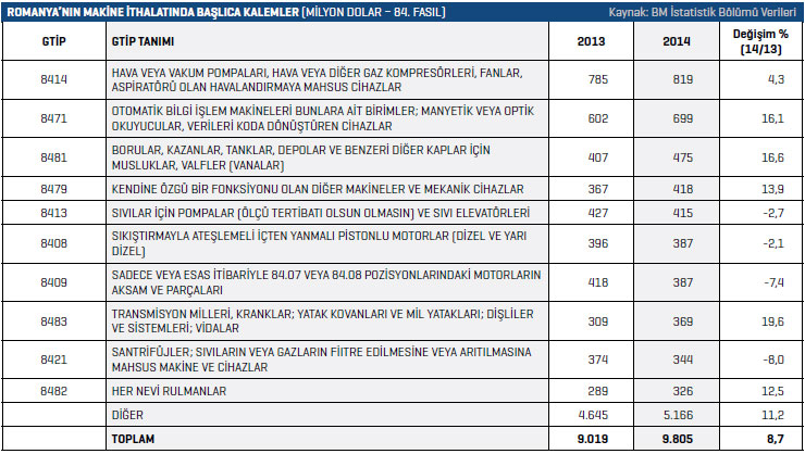 Romanya 2014 yılında en fazla hava veya vakum pompaları, hava veya diğer gaz kompresörleri, fanlar, aspiratörü olan havalandırmaya mahsus cihazlar kaleminde ürün ithal etti. 2013 yılında söz konusu ürün grubunda 785 milyon dolarlık ithalat gerçekleştirilirken bu rakam, 2014 yılında yüzde 4,3 artarak 819 milyon dolar olarak kayda geçti. Listenin ikinci sırasında otomatik bilgi işlem makineleri bunlara ait birimler; manyetik veya optik okuyucular, verileri koda dönüştüren cihazlar bulunuyor. Romanya, 2014 yılında söz konusu kalemde 699 milyon dolar değerinde makine ithal etti. 2013 yılında bu rakam 602 milyon dolardı. Romanya’nın söz konusu ürün grubundaki ithalatı 2014 yılında yüzde 16,1 arttı. Romanya’nın en fazla ithalat gerçekleştirdiği üçüncü kalem borular, kazanlar, tanklar, depolar ve benzeri diğer kaplar için musluklar, valfler (vanalar) oldu. 2013 yılında söz konusu ürün grubunda 407 milyon dolarlık ithalat gerçekleştirilirken bu rakam, 2014 yılında yüzde 16,6 artarak 475 milyon dolar oldu. Romanya’nın 2014 yılında makine ithalatında en fazla artış yüzde 19,6 ile transmisyon milleri, kranklar; yatak kovanları ve mil yatakları; dişliler ve sistemleri; vidalar kaleminde gerçekleşti. 2013 yılında söz konusu ürün grubunda 309 milyon dolar değerinde ithalat gerçekleştirilirken, 2014 yılında bu rakam 369 milyon dolar seviyesine yükseldi.