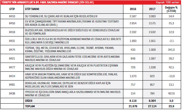 Türkiye ise 2016 yılında, Arnavutluk’un en fazla makine ihraç ettiği ülkeler listesinde 1,1 milyon dolarla beşinci sırada yer aldı. Arnavutluk’un Türkiye’ye yönelik makine ihracatı 2016 yılında bir önceki yıla oranla yüzde 732,8 artarken, Arnavutluk, 2016 yılında 84. fasıl itibarıyla en fazla ağır iş makine ve cihazlarının aksam ve parçaları kaleminde ihracat gerçekleştirdi. 2015 yılında söz konusu ürün grubunda 1,4 milyon dolarlık ürün ihraç edilirken 2016 yılında bu rakam, yüzde 171,9 artarak 4 milyon dolar seviyesinde kaydedildi. Listenin ikinci sırasında ise yazı, hesap, muhasebe, bilgi işlem, büro için diğer makine ve cihazların aksamı ürün grubu bulunuyor. Söz konusu kalemde 2015 yılında gerçekleştirilen ihracatın değeri 1,6 milyon dolarken, 2016 yılında bu rakam yüzde 40 artarak 2,3 milyon dolar seviyesinde kayda geçti. Listenin üçüncü sırasında bulunan kaldırma, istifleme, yükleme, boşaltma makine ve cihazları kaleminde de 2015 yılında 991 bin dolar değerindeki ihracat 2016’da yüzde 115,4 artışla 2,1 milyon dolara yükseldi. Arnavutluk’un 2016 yılında bir önceki yıla oranla ihracatını en fazla artırdığı ürün grubu ise yüzde 2 bin 80 ile metal dökümü için kasalar, plakalar, kalıp modelleri oldu.