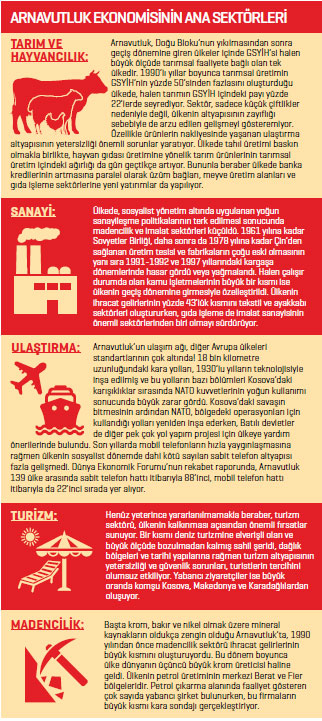 İşsizlik oranının 2016 yılında yüzde 16 olarak ölçüldüğü ülkenin GSYİH’si, halen büyük ölçüde tarımsal faaliyete bağlı ve nüfusun büyük bir kısmı da bu alanda istihdam ediliyor. Arnavutluk ekonomisi, henüz dış ekonomik dengelerin korunmasını sağlayabilecek, istikrarlı döviz gelirini üretebilecek, rekabetçi ihracat sektörleri oluşturmaktan uzak bir görünüm sergiliyor. Uzmanlar, ülkedeki tarım sektörünün ise küçük çiftliklerden oluşması ve altyapı sorunları nedeniyle arzu edilen gelişmeyi gösteremediğini belirtiyor. Organik gıda alanında önemli bir ihraç potansiyeline sahip olmakla beraber, paketleme ve ambalajlamayla ilgili sorunlar ve zeytinyağı, meyve, şarap gibi katma değeri yüksek ürünlere yeterli önemin verilmemesi sebebiyle söz konusu sektörde istenilen gelişme yakalanamıyor. Başta İtalya olmak üzere batılı ülkeler için tekstil ve deri eşyada fason üretim yapılan ülkede inşaat sektörü ise ekonomideki en aktif alanlardan biri. Henüz yeterince yararlanılmamakla beraber turizm sektörü de ülkenin kalkınması açısından önemli fırsatlar sunuyor. Arnavutluk enerji ve ulaşım altyapısında ise Avrupa standartlarına göre son derece yetersiz durumda!
