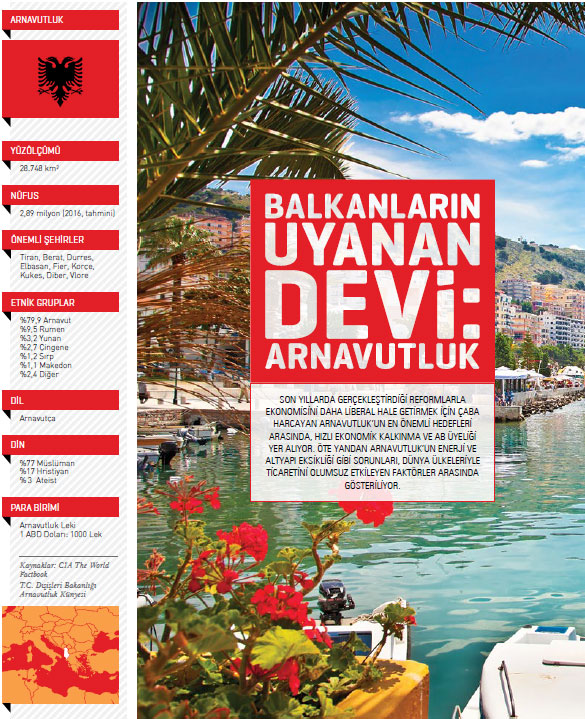 2016 yılında nominal GSYİH büyüklüğüne göre dünyada 11,8 milyar dolarla 126’ncı sırada yer alan Arnavutluk’un aynı yıla dair büyüme rakamı ise yüzde 3,3 olarak açıklanmıştı. 2017 yılında bu oranın yüzde 3,7 olacağı beklenirken, Dünya Bankası’nın “Doing Business - İş Yapma Kolaylığı 2017” raporuna göre ülke, 190 ülke arasında 58’inci sırada bulunuyor. Ancak ülkede devam eden büyük altyapı projelerine bağlı olarak (Trans Adriyatik Boru Hattı, Statkraft/Dewol Hidroelektrik Tesisi) ithalatın artacağı da beklentiler arasında yer alıyor.