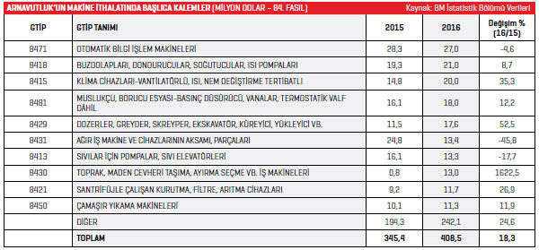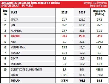Arnavutluk’un İtalya’dan gerçekleştirdiği ithalat yüzde 37,3 artarken, 2015 yılında listenin ikinci sırasında bulunan Çin’den 55,2 milyon dolar değerinde makine ithal eden Arnavutluk, 2016 yılında bu rakamı yüzde 25,2 artışla 69,2 milyon dolara yükseltti. Listesinin üçüncü sırasındaki Almanya’dan 2015 yılında 22,7 milyon dolarlık ithalat gerçekleştirilirken, 2016 yılında bu rakam yüzde 31,5 artışla 29,8 milyon dolar oldu. Türkiye ise 22,9 milyon dolarla 2016 yılında Arnavutluk’un en fazla makine ithal ettiği ülkeler listesinin dördüncü sırasında yer aldı. Arnavutluk, 2016 yılında en fazla otomatik bilgi işlem makineleri kaleminde ürün ithal etti. 2015 yılında söz konusu ürün grubunda 28,3 milyon dolarlık ithalat gerçekleştirilirken 2016 yılında bu rakam yüzde 4,6 azalarak 27 milyon dolar olarak kayda geçti. Listenin ikinci sırasında buzdolapları, dondurucular, soğutucular, ısı pompaları ürün grubu yer alırken, 2015 yılında söz konusu kalemde 19,3 milyon dolar değerinde makine ithal edilmişti. 2016 yılında bu rakam yüzde 8,7 artışla 21 milyon dolar oldu. Arnavutluk’un en fazla ithalat gerçekleştirdiği üçüncü kalem de 2015 yılında 14,8 milyon dolarlık ithalat gerçekleştirdiği klima cihazları-vantilatörlü, ısı, nem değiştirme tertibatlı ürün grubu oldu. 2016 yılında bu rakam yüzde 35,3 artarak 20 milyon dolar oldu. Arnavutluk’un 2015 yılı makine ithalatında en fazla artış yüzde 1.622,5 ile toprak, maden cevheri taşıma, ayırma seçme vb. iş makineleri kaleminde gerçekleşti.