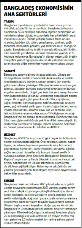 Hazır giyim sektörü ve işçi gelirleri ekonominin en dinamik olduğu alanlar olarak öne çıkarken, ülke tek bol kaynağı olan düşük ücretli, emek yoğun iş gücünü iyi bir şekilde kullanıyor. Kişi başına ortalama gelir yıllık 2 bin dolara yaklaşırken, uzmanlar GSYİH’nin yüzde 7 oranında büyümesinin ülkedeki yoksulluğu önemli oranda düşürebileceğini belirtiyor. Bu hedefe ulaşmadaki en önemli engel ise tasarruf ve yatırım oranlardaki düşük büyüme hızı olarak dikkat çekiyor. Bangladeş’te yurt içi tasarrufların GSYİH’ye oranı yaklaşık yüzde 20 iken, yatırımların GSYİH’ye oranı da yaklaşık yüzde 25 civarında seyrediyor.