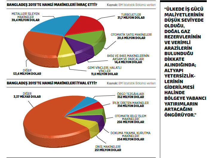 Bangladeş’in makine ithalatı ise 2015’te 4,79 milyar dolar oldu. 2015 yılı rakamlarına göre Bangladeş’in en fazla makine ithal ettiği ilk 10 ülke listesinin ilk sırasında 1,57 milyar dolarla Çin yer alırken, listenin ikinci sırasında bulunan Singapur’dan 468,8 milyon dolar değerinde makine ithal edildi. Listesinin üçüncü sırasındaki Almanya’dan 2015’te ithal edilen makinelerin değeri ise 403,2 milyon dolar oldu. Bangladeş 2015’te listenin dördüncü sırasındaki Hindistan’dan 389,8 milyon dolarlık makine ithal ederken, beşinci sıradaki Japonya’dan ise 258,6 milyon dolarlık ithalat gerçekleştirdi. Türkiye, 53,8 milyon dolarla Bangladeş’in 2015 yılında en fazla makine ithal ettiği ülkeler listesinin 16’ncı sırasında bulunuyordu. Bangladeş 2015’te 84. fasıl itibarıyla en fazla örgü tezgâhları, gipür, tül, dantela, file imali makine ve cihazları kaleminde ithalat gerçekleştirdi. Söz konusu kalemdeki ithalat tutarı 352 milyon dolar olarak kayda geçerken, listenin ikinci sırasında 314 milyon dolarlık ithalatla lifleri hazırlayan, iplik üreten-hazırlayan makineler bulunuyor. Bangladeş’in 2015’te en fazla ithalat gerçekleştirdiği üçüncü kalem ise 256 milyon dolarla otomatik bilgi işlem makineleri ve üniteleri oldu. 2015 yılı itibarıyla en fazla ithalat gerçekleştirilen dördüncü mal grubu 254 milyon dolarla dokuma maddelerini yıkama, kurutma, ütüleme makine ve cihazları olarak kayda geçerken, beşinci sırada ise 251 milyon dolarla dikiş makineleri, mobilyaları, iğneleri, aksam ve parçaları yer aldı.
