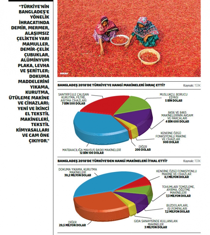 TÜİK verilerine göre 2018 yılı itibarıyla Bangladeş’in Türkiye’den gerçekleştirdiği makine ithalatının ilk sırasında yüzde 17,2 artış ve 39,2 milyon dolarla dokuma maddelerini yıkama, kurutma, ütüleme makine ve cihazları yer alıyor. Söz konusu kalemde 2017’de gerçekleştirilen ithalatın değeri 33,4 milyon dolardı. Listenin ikinci sırasında bulunan kendine özgü fonksiyonlu makine ve cihazlar ürün grubunda 8,1 milyon dolarlık ithalat kayda alınırken, Bangladeş’in Türkiye’den makine ithalatında ilk 10 ürün listesinin üçüncü sırasında ise tohumları temizleme, ayırma, öğütme, işleme makine ve cihazları ürün grubu bulunuyor. 2017 yılında söz konusu kalemde 2 milyon dolarlık ithalat gerçekleştirilirken 2018 yılında bu rakam yüzde 260,5 artışla 7,3 milyon dolar seviyesinde kaydedildi.