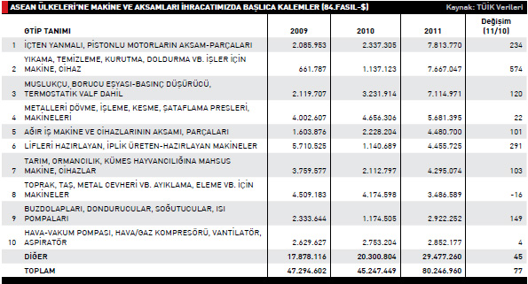 Makine ve aksamları sektöründe,ülkemiz ile ASEAN ülkeleri arasındaki dış ticaret dengesinin ülkemiz aleyhine olduğu görülüyor. Dış ticaret dengesi 2011 yılında bir önceki yıla göre yüzde17 artış gösterdi ve eksi 474 milyon dolar olarak gerçekleşti. 2011 yılında iki ülke arasındaki dış ticaret hacmi bir önceki yıla göre yüzde 28,1 oranında artarak yaklaşık 635 milyon dolar olarak kaydedildi.