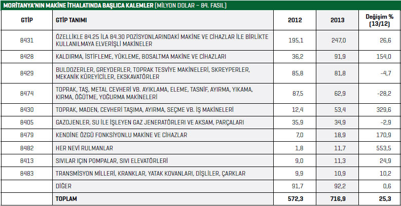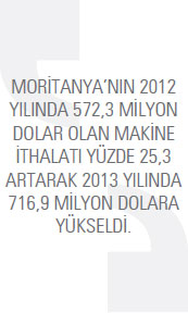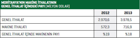 3,267 milyar dolar olarak gerçekleştiği tahmin ediliyor. 2012 yılında dış ticaretin 412 milyon dolar açık verdiği belirtiliyor. Uluslararası Ticaret Merkezinin (ITC) Moritanya’nın ihracatına ilişkin verileri Moritanya’dan kaynaklanan nedenlerle eksik ve yetersizdir. Yıllar itibariyle birçok ihracat kalemi ihracat verilerinde gözükmez. Örneğin ülkenin en büyük ihracat kalemi olan demir cevherleri ihracatı 2010 ve 2011 yıllarında istatistiklerde yer almıyor. Moritanya’nın yıllık 1 milyar dolar civarında demir minerali ve işlenmiş demir ihracatının olduğu biliniyor. Bunun gibi diğer birçok ürünün ihracatının da henüz istatistiklere işlenmemiş olduğu görülüyor. 2012 yılında ise Moritanya’nın ihracatı 2,6 milyar dolardır. ITC’nin geçici verilerine göre 2012 yılında Moritanya ihracatı dörtlü bazda 260 farklı üründe gerçekleştirdi. Bu ihracatın da yaklaşık yüzde 53’ünü demir cevheri, yüzde 20’sini su ürünleri, yüzde 17’sini de bakır cevheri ihracatı oluşturdu. Bu üç ürün grubu toplam ihracatın yüzde 90’ını meydan getiriyor. ITC verilerine göre Moritanya’nın 2012 yılı ithalatı 3,199 milyar dolardır. İthalatta petrol yaklaşık yüzde 20’lik bir paya sahiptir. Petrolden sonra şeker, buğday ve palm yağı ithalatta önemli yer tutan diğer ürünlerdir. Moritanya 2012 yılında 572,3 milyon dolarlık makine ithal ederken 2013 yılında bu rakam yüzde 25,3 artışla 716,9 milyon dolara yükseldi. Moritanya’da gümrük vergilerinin nispeten yüksek olduğu kabul ediliyor. Uygulanan KDV oranı ise yüzde 14’tür. Ancak, yapılan düzenlemelerle gümrük tarifeleri gittikçe düşürüldü. Gümrüklerde gecikmeler yaşanabilmekte ve gümrük işlemleri bazı durumlarda uzun zaman alabiliyor. Ödemelerde akreditif kullanılabilmekte ancak akreditifli ödeme yüksek masrafları gerektirebiliyor.