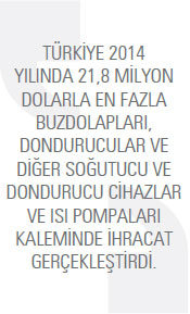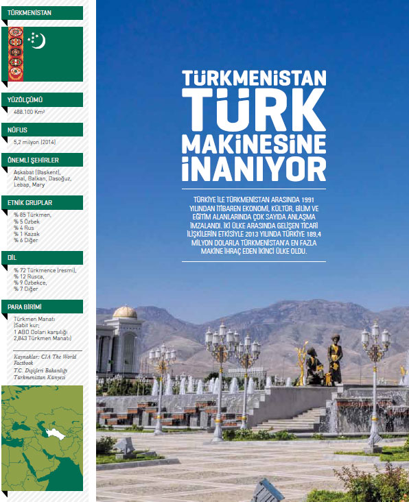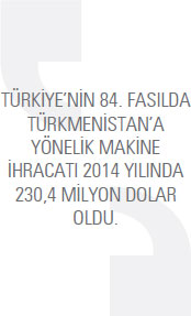 Türkiye’nin 84. fasılda Türkmenistan’a gerçekleştirdiği makine ihracatı 2014 yılında 230,4 milyon dolar olarak kayda geçti. 2013 yılında bu rakam 189,1 milyon dolar seviyesindeydi. Türkmenistan’a yönelik makine ihracatı 2014 yılında yüzde 21,8 arttı. Türkiye 2014 yılında 21,8 milyon dolarla en fazla buzdolapları, dondurucular ve diğer soğutucu ve dondurucu cihazlar ve ısı pompaları kaleminde ihracat gerçekleştirdi. Söz konusu kalemde 2013 yılında Türkiye’nin ihracatı 16,5 milyon dolardı. Türkmenistan’a yönelik buzdolapları, dondurucular ve diğer soğutucu ve dondurucu cihazlar ve ısı pompaları ürün grubundaki ihracat 2014 yılında yüzde 32 arttı. Listenin ikinci sırasında bulunan toprak, taş, metal cevheri vb. ayıklama, eleme, tasnif, ayırma, yıkama, kırma, öğütme, yoğurma vb. kaleminde, 2013 yılında 17,8 milyon dolarlık ihracat gerçekleştirilirken bu rakam 2014 yılında yüzde 21,3 artarak 21,6 milyon dolar seviyesine yükseldi. Türkiye’nin Türkmenistan’a yönelik makine ihracatının üçüncü sırasında borular, kazanlar, tanklar, depolar ve benzeri diğer kaplar için musluklar, valfler (vanalar) ve benzeri makineler yer alıyor. 2014 yılında söz konusu kalemde gerçekleştirilen ihracatın değeri 20,2 milyon dolar oldu. 2013 yılında bu rakam 16,7 milyon dolar seviyesindeydi. Söz konusu mal grubunda gerçekleşen ihracat artışı yüzde 21,2 oldu. 2014 yılında Türkiye’nin Türkmenistan’a yönelik makine ihracatında en fazla artış yüzde 151,8 ile özellikle 84.25 ila 84.30 pozisyonlarındaki makina ve cihazlar ile birlikte kullanılmaya elverişli cihazlar kaleminde gerçekleşti. Söz konusu mal grubunda 2013 yılında 2,5 milyon dolar değerinde ürün ihraç edilirken 2014 yılında bu rakam, 6,2 milyon dolar seviyesine yükseldi.