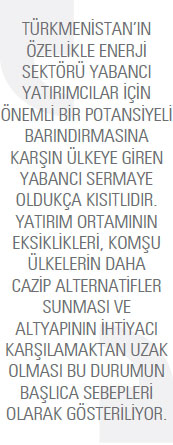 Türkmenistan’da özellikle enerji sektörü yabancı yatırımcılar için önemli bir potansiyel arz etmesine rağmen, ülkeye giren yabancı sermaye oldukça kısıtlıdır. Bu durumun başlıca sebepleri yatırım ortamının eksiklikleri, komşu ülkelerin daha cazip alternatifler sunması ve altyapının ihtiyacı karşılamaktan uzak olmasıdır. Bununla birlikte Türkmenistan tekstil alanında ülkeye yabancı sermaye çekme konusunda nispeten daha başarılıdır. Türkmen makamları tarafından yabancı sermayeye destek verildiği ifade edilmesine rağmen, olumlu bir yatırım ortamı yaratmak için gerekli olan siyasi ve makroekonomik reformlar arzu edilen düzeyde gerçekleştirilebilmiş değildir. Türkiye ile Türkmenistan arasında 1991 yılından itibaren ekonomi, kültür, bilim ve eğitim alanında pek çok protokol ve anlaşma imzalandı. Dış ticaret verilerine göre 2013 yılında Türkiye’nin Türkmenistan’a ihracatı bir önceki yıla göre yüzde 32,4 oranında artarak 1,96 milyar dolara yükseldi. İthalat ise yüzde 115,4 oranında artarak 654 milyon dolara ulaştı. İki ülke arasındaki ticari ilişkiler, özellikle müteahhitlik alanında 2008 yılından itibaren rekor seviyelere ulaşarak hızlı bir artış ivmesi kazandı. İnşaat alanında büyük oranda Türk menşeli malzemelerin kullanılması, Türkiye’nin ihracatını artırdı. Bununla birlikte, piyasada Türk mallarının kalitesi nedeniyle artan talebe bağlı olarak giyim ve gıda sektöründe mal hareketleri de arttı.