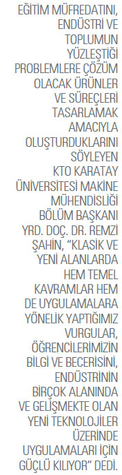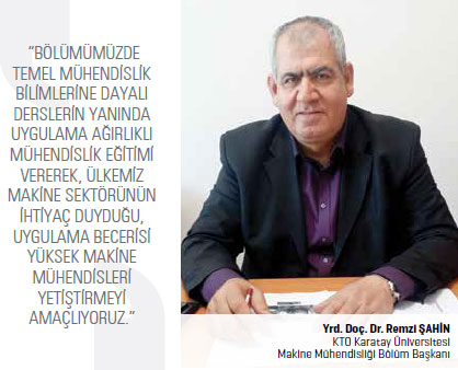 üniversite-sanayi iş birliği projeleriyle ilgili sorularımızı yanıtladı. KTO Karatay Üniversitesi Makine Mühendisliği Bölümü ne zaman kuruldu? Eğitimde belirlediğiniz temel hedefler nelerdi? 2009 yılında kurulan KTO (Konya Ticaret Odası) Karatay Üniversitesi bünyesinde Makine Mühendisliği bölümü 2012-2013 eğitim-öğretim yılında lisans programına ilk öğrencilerini kabul etti. Bölümümüz, makine mühendisliği konularını anlamlı bir bütünlük içinde öğrenciye sunmayı ve böylece konusunda her türlü ihtiyaca cevap verebilmek için gerekli alt teknolojileri kullanabilecek veya bu alandaki uzmanlarla iletişim kurarak ürün tasarımını, üretimini, montajını ve bakımını gerçekleştirebilecek mühendisler yetiştirmeyi amaçlıyor. Ayrıca, mühendislik fakültesinde bulunan mekatronik mühendisliği ile birlikte bütünleşik mühendislik uygulamaları yaparak endüstrinin pek çok alanında otomasyon ve robot teknolojilerinde büyük ölçüde uygulamalar gerçekleştirmeyi de hedefliyor. Bölümümüzdeki derslerin yüzde 30’u İngilizce veriliyor. Günümüzde İngilizce ortak dil olarak dünya genelinde yaygınlaştığı için kaynak eserlerin anlaşılması ve tartışılması için bu dilin kullanılmasının zorunlu olduğunu inancındayız. Bununla birlikte mesleki anlamda teknik konuların eğitiminin ana dilde verilmesi öğrencilerin hızlı bir şekilde konuyu kavraması açısından çok yararlı oluyor. Bu modelin sağladığı bir diğer yarar da, mühendislerin endüstride kullanılan Türkçe teknik