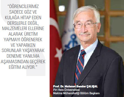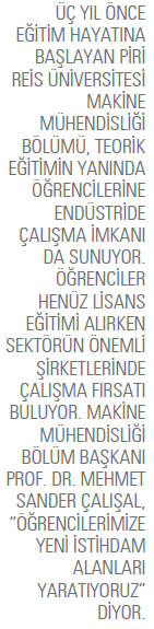 yılında açılan Makine Mühendisliği Bölümü öğrencilerine teorik eğitimin yanında endüstride çalışma imkanı da sunuyor. Bunun için hayata geçirdikleri projeleri de var. “Endüstri ile Ortak Eğitim Programı” olarak adlandırdıkları bir program uyguluyorlar. Bu program sayesinde öğrenciler henüz lisans eğitimi alırken, bir taraftan da sektörün önemli şirketlerinde deneyim kazanabiliyorlar. Mezuniyet sonrası da isterlerse Tuzla Gemi İnşa Bölgesi’nde istihdam ediliyorlar. Piri Reis Üniversitesi henüz yeni kurulmasına rağmen oldukça iddialı. Üniversite proje tabanlı öğretimi önemsiyor. Öğrenciler bu eğitim vizyonu sayesinde sadece okuyarak ya da dinleyerek değil, malzemeleri eline alarak, üretim yapmayı öğreniyorlar. Üniversitenin eğitim dinamiklerini ve uzun vadeli hedeflerini Makine Mühendisliği Bölüm Başkanı Mehmet Sander Çalışal ile konuştuk.