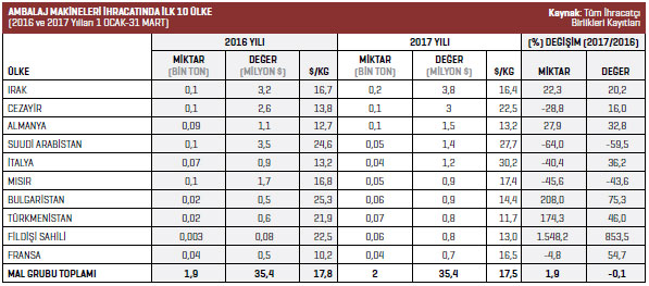 Ambalaj makineleri ürün grubunda 2017 Ocak-Mart