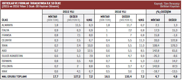 2016 yılının Ocak-Haziran döneminde Türkiye geneli ısıtıcılar ve fırınlar mal grubunda en fazla ihracat artışı yüzde 129,3 ile İran’da yaşandı. Bu ülkenin ardından yüzde 122,8 ile Cezayir gelirken yüzde 87,3 ile Polonya üçüncü sırada yer aldı.