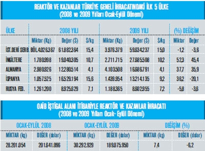 Ülkemiz reaktör ve kazanlar ihracatı 2008 yılının Ocak-Eylü döneminde gerileme gösterdi. 2008 yılının Ocak-Eylül döneminde 201 milyon 641 bin dolar olan reaktör ve kazanlar ihracatımız 2009 yılının Ocak-Eylül döneminde ise yüzde 6,2 oranında gerileme göstererek 189 milyon 75 bin dolar olmuş.