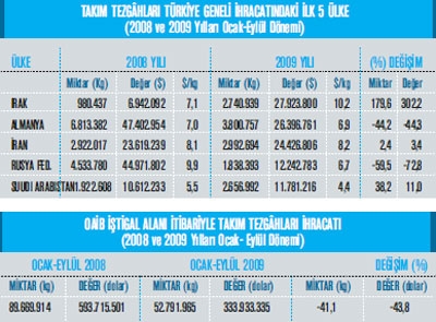Türkiye geneli takım tezgâhları ihracatı 2009 yılı Ocak-Eylül dönemi içerisinde incelendiğinde bu mal grubunda geçtiğimiz senenin aynı dönemine göre yüzde 43,8 oranında bir gerileme yaşandığı görülüyor. 2008 yılının Ocak-Eylül döneminde 593 milyon 715 bin dolar olan takım tezgâhları ihracatı mız 2009 yılının Ocak-Eylül dönemine gelindiğinde 333 milyon 933 bin dolar olmuş.