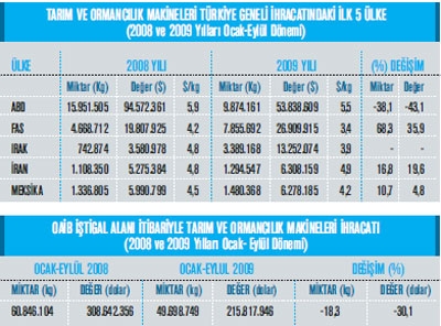 Tarım ve ormancılık makineleri 2009 yılı Ocak-Eylül döneminde ihracatında düşüş yaşanan mal grupları arasında yer alıyor. 2008 yılının Ocak-Eylül dönemi Orta Anadolu Makine ve Aksamları İhracatçıları Birliği iştigal alanı itibariyle ihracat kayıt rakamları incelendiğinde tarım ve ormancılık makineleri ihracatımızın 308 milyon 642 bin dolar iken 2009 yılının aynı dönemine gelindiğinde ise bu değerin yüzde 30,1 oranında gerileyerek 215 milyon 817 bin dolar olduğu görülüyor.