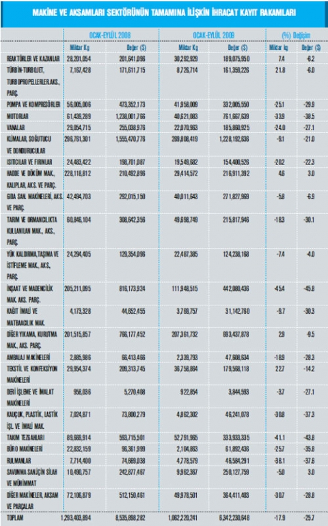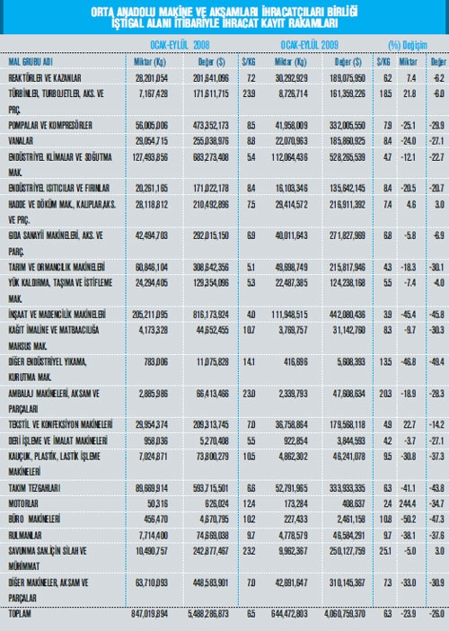 Orta Anadolu Makine ve Aksamları İhracatçıları Birliği iştigal alanına giren GTİP’ler kapsamı nda belirlenen Türkiye geneli ihracat kayıtlarına göre; 2008 yılı Ocak-Eylül dönemi ihracat kayıt rakamı 5 milyar 488 milyon dolar iken, bu rakam 2009 yılının eş zaman diliminde yüzde 26 oranında azalarak 4 milyar 60 milyon dolar olarak gerçekleşti. Makine sektörü toplamı, 84. faslın tamamı ve 84. fasıl dışı Orta Anadolu Makine ve Aksamları İhracatçıları Birliği iştigal alanı itibariyle 2009 yılının ilk 10 ayında önceki yılın aynı dönemine kıyasla yüzde 25,7 azalarak 6 milyar 342 milyon dolar olarak kaydedildi.