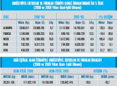 Türkiye endüstriyel ısıtıcılar ve fırınlar ihracatımız 2008 yılının Ocak-Eylül döneminde gerileme gösterdi. 2008 yılının Ocak-Eylül döneminde 171 milyon 22 bin dolar olan endüstriyel ısıtıcılar ve fırınlar ihracatımız 2009 yılının Ocak-Eylül dönemine gelindiğinde yüzde 20,7 oranında gerileme göstererek 135 milyon 642 bin dolar oldu. Endüstriyel ısıtıcılar ve fırınlar ihracatımız ülkeler bazında incelendiğinde ise Almanya’nın birinci sırada yer aldığı görülüyor. Almanya’ya 2008 yılının Ocak-Eylül döneminde Türkiye’den 28 milyon 909 bin dolarlı k endüstriyel ısıtıcılar ve fırınlar ihracatı yapılmışken 2009 yılının eş zaman dilimine gelindiinde ise bu değer yüzde 35 oranında düşerek 18 milyon 793 bin dolara indi. Endüstriyel ısıtıcılar ve fırınlar mal grubunda ihracatımızın en fazla olduğu ikinci ülke ise Fransa. Bu ülkeye 2008 yılının Ocak-Eylül döneminde 15 milyon 986 bin dolar olan endüstriyel ısıtıcılar ve fırınlar ihracatımız 2009 yılının Ocak-Eylül döneminde ise yüzde 30,6 gerileyerek 11 milyon 98 bin dolar oldu. Bu mal grubundaki üçüncü en büyük ihracat pazarımız ise Mısır olduğu görülüyor. Söz konusu ülkeye 2008 yılının Ocak-Eylül döneminde 8 milyon 506 bin dolarlık endüstriyel ısıtıcılar ve fırınlar ihracatı söz konusu iken 2009 yılının aynı dönemine gelindiğinde yüzde 16 değer düşüşüyle 7 milyon 146 bin dolar seviyesine indi. Endüstriyel ısıtıcılar ve fırınlar ihracatımızdaki en hızlı artışların yaşandığı ülkeler ise Türkmenistan, Urun ve Irak olarak sıralanıyor. Irak’a 2008 yılının Ocak-Eylül döneminde 2 milyon 843 bin dolarlık endüstriyel ısıtıcılar ve fırınlar ihracatı yapılmışken 2009 yılının Ocak-Eylül döneminde yüzde 107,1 oranında yüksek bir artış yaşanarak 5 milyon 887 bin dolar değerine ulaşılmış. Türkmenistan’da bu mal grubu için ihracat artış oranımızın en hızlı olduğu ülke konumunda. Türkmenistan’a 2008 yılının Ocak-Eylül döneminde 947 bin dolar endüstriyel ısıtıcılar ve fırınlar ihracatı söz konusu iken 2009 yılının aynı dönemine gelindiğinde ise 5 milyon 167 bin dolarlık ihracat yapılmış. 2008 yılı Ocak-Eylül döneminde en hızlı ihracat artışının yaşandığı bir diğer ülke ise Ürdün olmuş. Bu ülkeye yapılan endüstriyel ısıtıcılar ve fırınlar ihracatı geçen yılın Ocak-Eylül döneminde 1 milyon 306 bin dolar iken 2009 yılının Ocak-Eylül dönemine gelindiğinde ise 4 milyon 337 bin dolar değerine ulaşmış.
