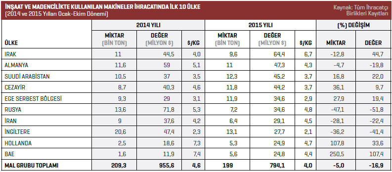 2015 yılının Ocak-Ekim döneminde Türkiye geneli inşaat ve madencilikte kullanılan makineler, aksam ve parçaları ihracatı listesinde en fazla artış yüzde 107,4 ile Birleşik Arap Emirlikleri’nde yaşandı. Listede yüzde 44,7 ile Irak ikinci sırada bulunurken söz konusu ülkeyi yüzde 33,6 ile Hollanda üçüncü sırada takip etti.