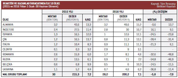2015 yılının aynı döneminde Almanya’ya gönderilen ürünlerin değeri 43,6 milyon dolardı. Söz konusu ülkeye yönelik ihracat artışı yüzde 13,7 oldu. İkinci sırada yer alan İngiltere’ye 2015 yılının Ocak-Haziran döneminde ihraç edilen ürünlerin değeri 27,5 milyon dolarken bu rakam 2016 yılının aynı döneminde yüzde 9,1 artışla 30 milyon dolar seviyesine yükseldi. Listenin üçüncü sırasında bulunan İspanya’ya 2016 yılının Ocak-Haziran döneminde 12,6 milyon dolarlık ihracat gerçekleştirildi. Listenin dördüncü sırasındaki Çin’e 2016 yılının Ocak-Haziran döneminde ihraç edilen reaktör ve kazanların değeri 11,3 milyon dolar olarak kaydedildi. Listenin beşinci sırasında bulunan İtalya’ya 2015 yılının Ocak-Haziran döneminde 10,4 milyon dolarlık ihracat gerçekleştirilirken 2016 yılının aynı döneminde bu rakam yüzde 6,1 artışla 11,1 milyon dolar oldu.