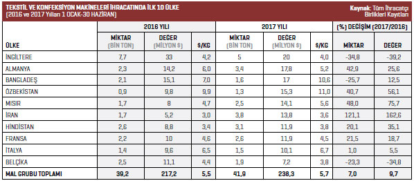 Tekstil ve konfeksiyon makineleri ürün grubu ihracatı 2016 yılının Ocak-Haziran döneminde, 217,2 milyon dolarken 2017 yılının aynı döneminde bu rakam yüzde 9,7 artışla 238,3 milyon dolar oldu.