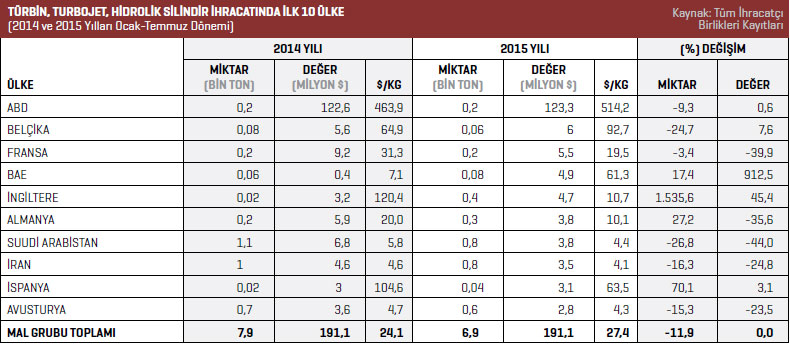 2015 yılının Ocak-Temmuz döneminde Türkiye geneli türbin, turbojet, hidrolik silindir aksam ve parçaları sektöründe en fazla ihracat artışı yüzde 912,5 ile Birleşik Arap Emirlikleri’nde gerçekleşti. Listede İngiltere yüzde 45,4 ile ikinci, Belçika ise yüzde 7,6 ile üçüncü sırada yer aldı.