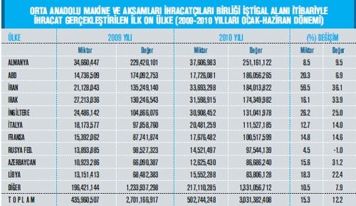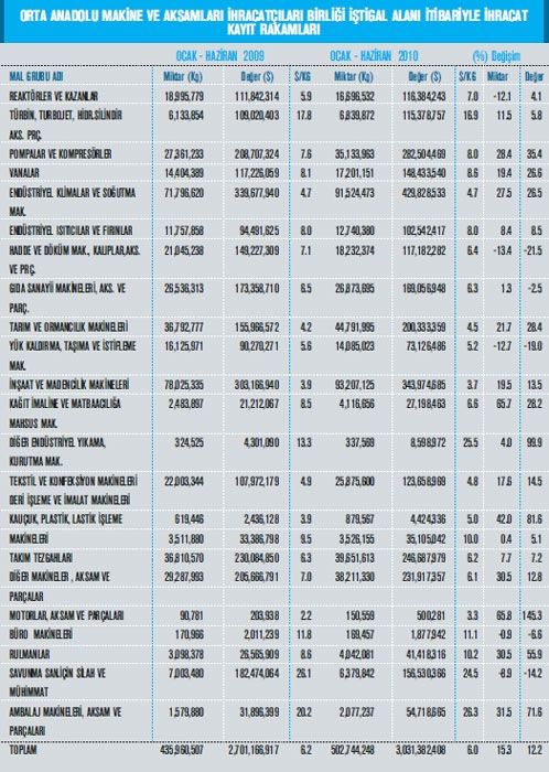 Orta Anadolu Makine ve Aksamları İhracatçıları Birliği iştigal alanına giren GTİP’ler kapsamında belirlenen Türkiye geneli ihracat kayıtlarına göre; 2009 yılı Ocak-Haziran dönemi ihracat kayıt rakamı 2 milyar 701 milyon dolar iken, bu rakam 2010 yılının eş zaman diliminde yüzde 12,2 oranında artarak 3 milyar 31 milyon dolar olarak gerçekleşti. Makine sektörü toplamı, 84. faslın tamamı ve 84. fasıl dışı Orta Anadolu Makine ve Aksamları İhracatçıları Birliği iştigal alanı itibariyle 2010 yılının ilk 6 ayında önceki yılın aynı dönemine kıyasla yüzde 17,3 artarak 4 milyar 822 milyon dolar olarak kaydedildi. Mal grupları bazında incelendiğinde ise; 2009 yılı Ocak-Haziran döneminde, ihracatında en yüksek artış gerçekleşen kalemler ise yüzde 145 ile Motorlar, Aksam ve Parçaları, yüzde 99,9 ile Diğer Endüstriyel Yıkama ve Kurutma Makineleri ve yüzde 81,6 ile Deri İşleme ve İmalat Makineleri olmuş. 2009 yılı Ocak-Haziran dönemi ihracatında en fazla gerileme görülen grupları ise; Hadde ve Döküm Makineleri ve Kalıplar, Yük Kaldırma, Taşıma ve İstifleme ile Savunma Sanayi için Silah ve Mühimmat olarak sıralanıyor.
